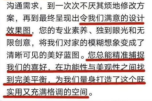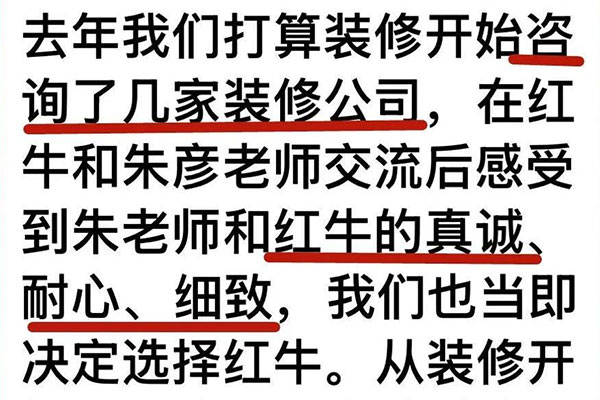 這次找紅牛裝飾公司裝修,也是朋友介紹的。各方面安排比較及時到位,質(zhì)量控制上也比較好,總體感覺滿意。設(shè)計師顧娟工作負責(zé),業(yè)務(wù)能力、協(xié)調(diào)能力都較強,為這次裝修的滿意完工奠定了基礎(chǔ)!項目經(jīng)理錢新平統(tǒng)籌能力較強,工作負責(zé),安排的水電工、瓦工、木工和油漆工都比較認真負責(zé),手藝也不錯,保證了裝修的施工質(zhì)量。工程監(jiān)理宋昕業(yè)務(wù)精湛,工作認真負責(zé),對裝修施工考慮全面,對質(zhì)量要求嚴格,經(jīng)常深入工地巡查,發(fā)現(xiàn)問題及時指出,很好地為施工質(zhì)量把了關(guān)。這次找紅牛裝飾公司裝修的體驗是愉快的,謝謝各位!